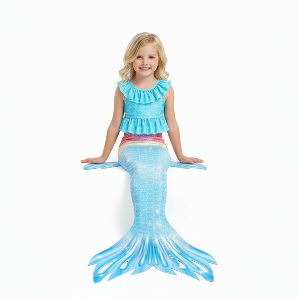 Cette nouvelle queue de sirène de luxe Rainbow Sky avec des nageoires dorsales ajoutées est livrée avec un haut de tankini à volants assorti avec un dos croisé